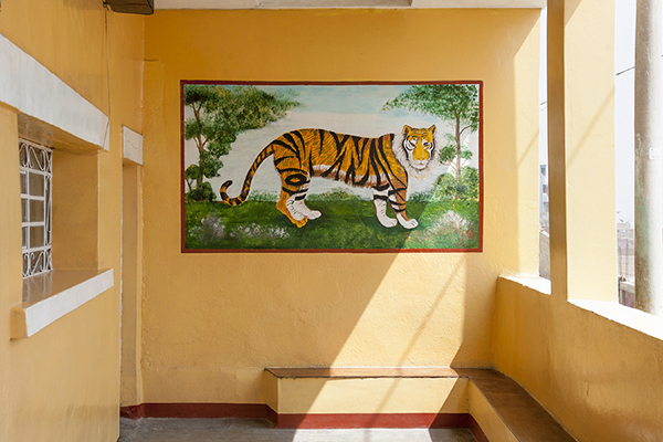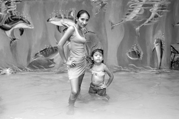 - Two girls sit in a piece of concrete located in the middle of the pool. In the back a mother holds her daughter. Sinchi Rocha Park. Comas, Lima – Peru.