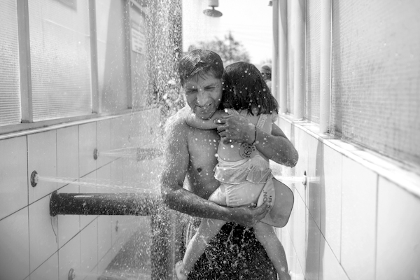 - A father holds his daughter in arms while walking through the showers. Everyone has to pass through the showers in order to get into the pools. Sinchi Roca Park. Comas, Lima – Peru.
