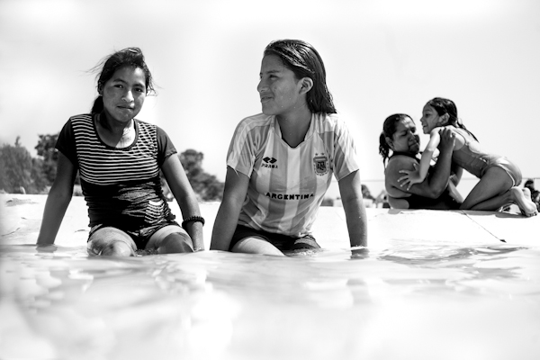 - A girl holds and covers her sister under her towel. Sinchi Roca Park. Puente Piedra, Lima – Peru.