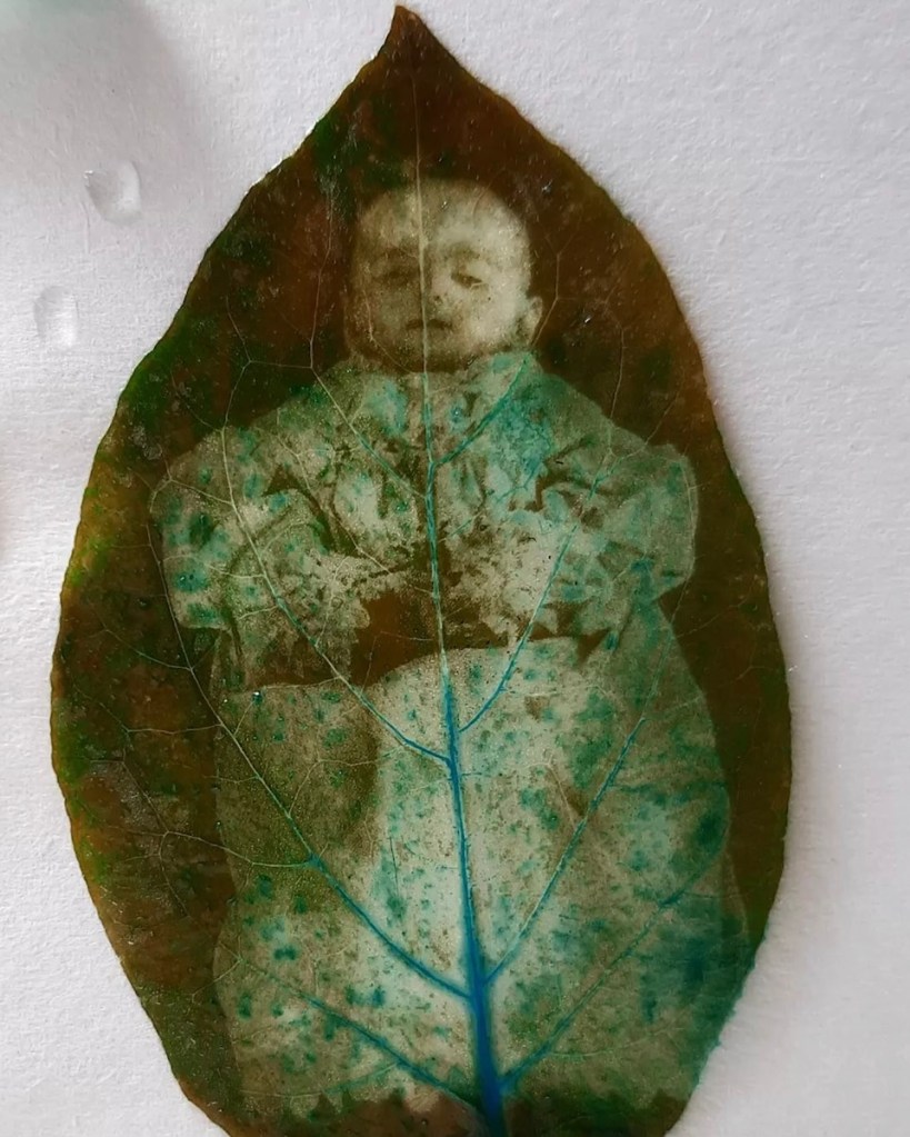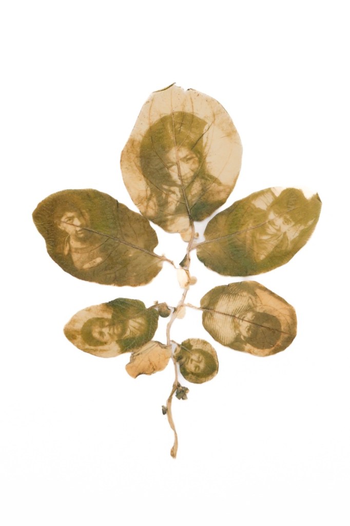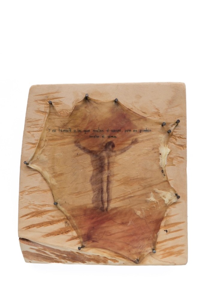 Cianotipia virada a la clorofila sobre fibra de carne de cerdo. Aprendí desde las ciencias naturales que somos un conjunto de sistemas y pedazos. La medicina nos estudiaba por partes – un descuartizamiento del cuerpo que reducía la existencia a su ciclo de desarrollo humano – Mi acto fotográfico  reivindica el cuerpo como un todo humano.