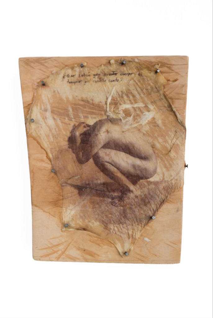 Cuando mi madre me parió, me dio a la luz, esa luz entró en mi cuerpo…. La acción de unir no representa estados incompletos que finalizan en artefactos. El collage orgánico es mi intención por reorganizar, depurar y regurgitar de mi cuerpo aquellos organismos que intentan detener su normal proceso biológico y mental.